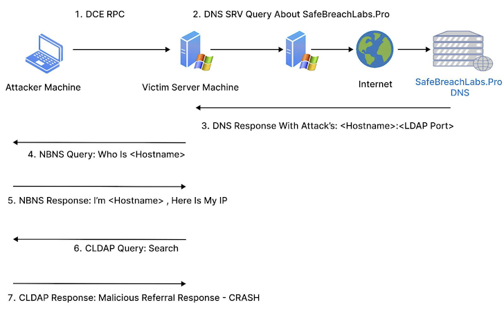 En concreto, implica enviar una solicitud DCE/RPC al servidor víctima, lo que en última instancia provoca que el Servicio de subsistema de autoridad de seguridad local (LSASS) se bloquee y fuerce un reinicio cuando se envía un paquete de respuesta de referencia CLDAP especialmente diseñado con un valor distinto de cero para "lm_referral".